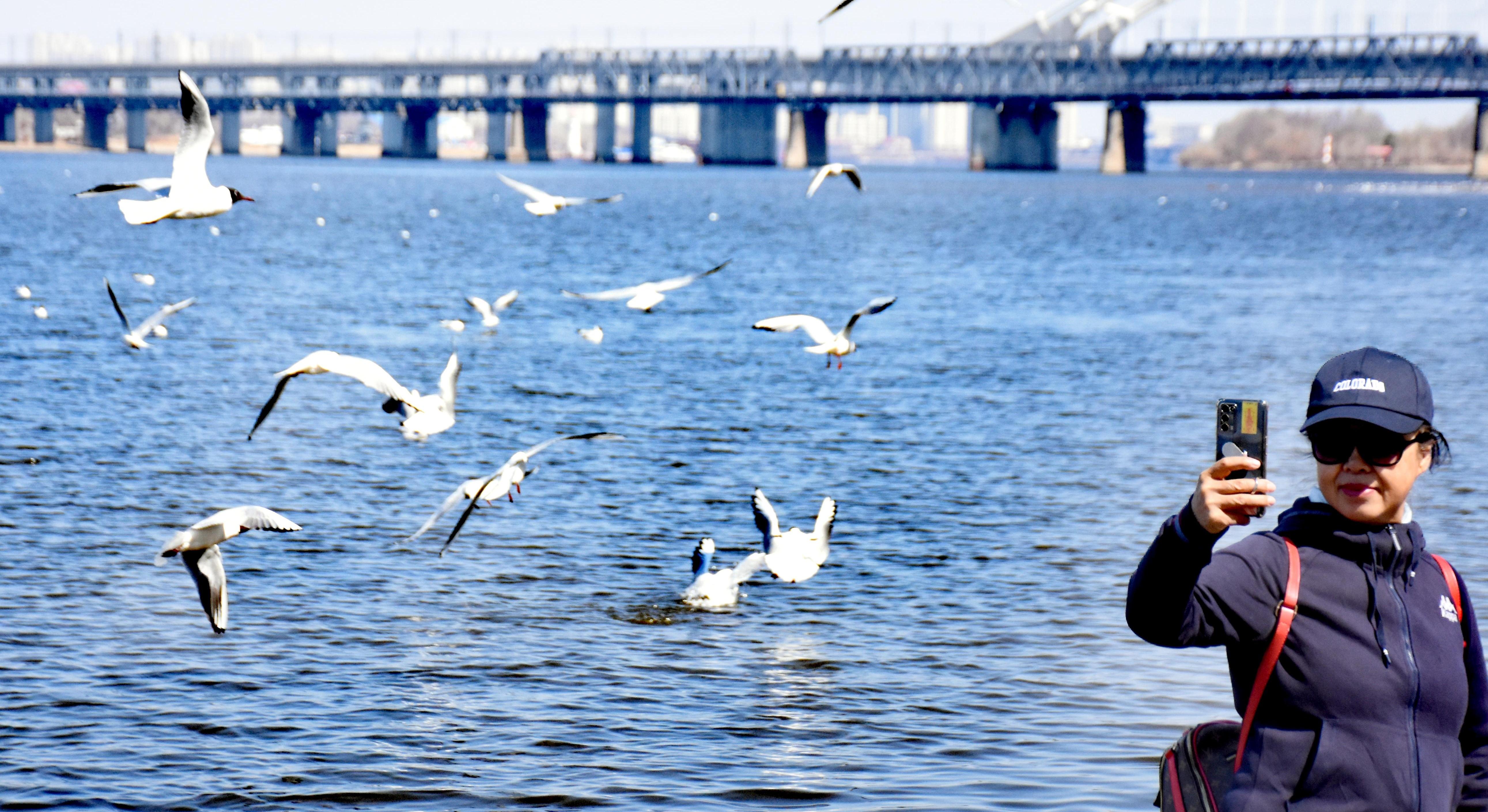近千红嘴鸥翔集江畔 游人扎堆打卡拍照